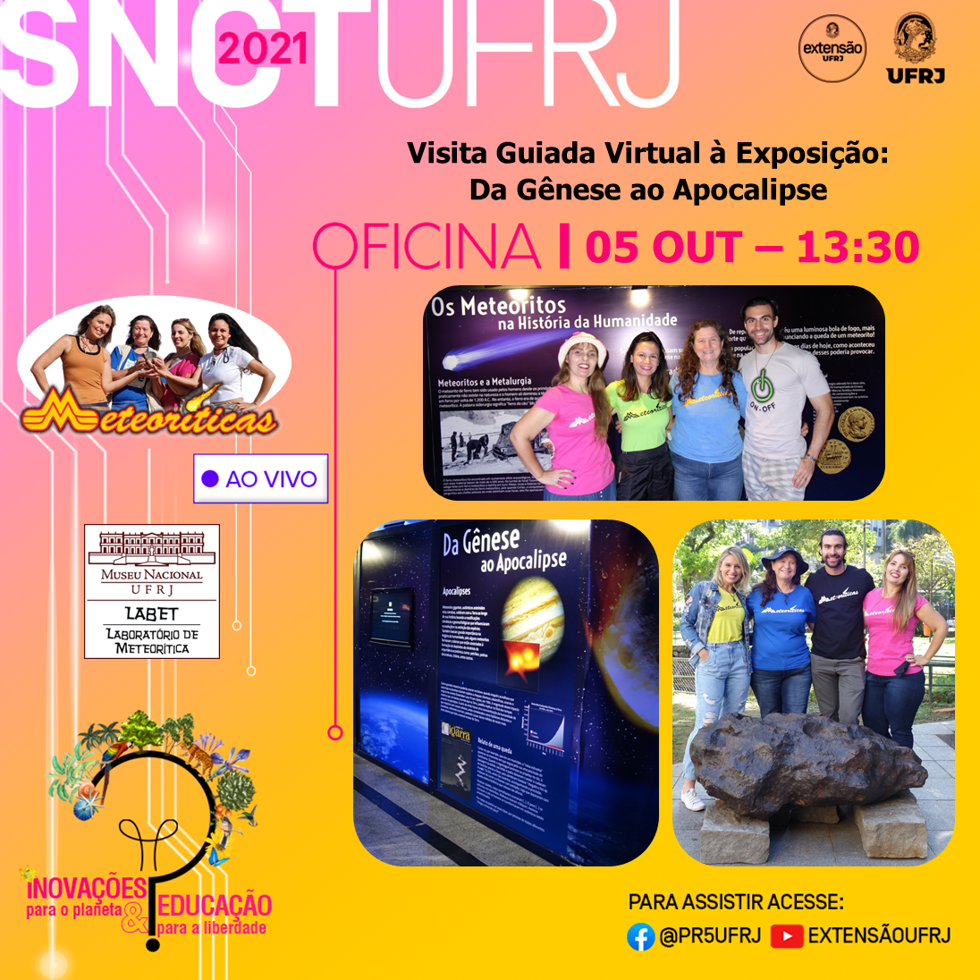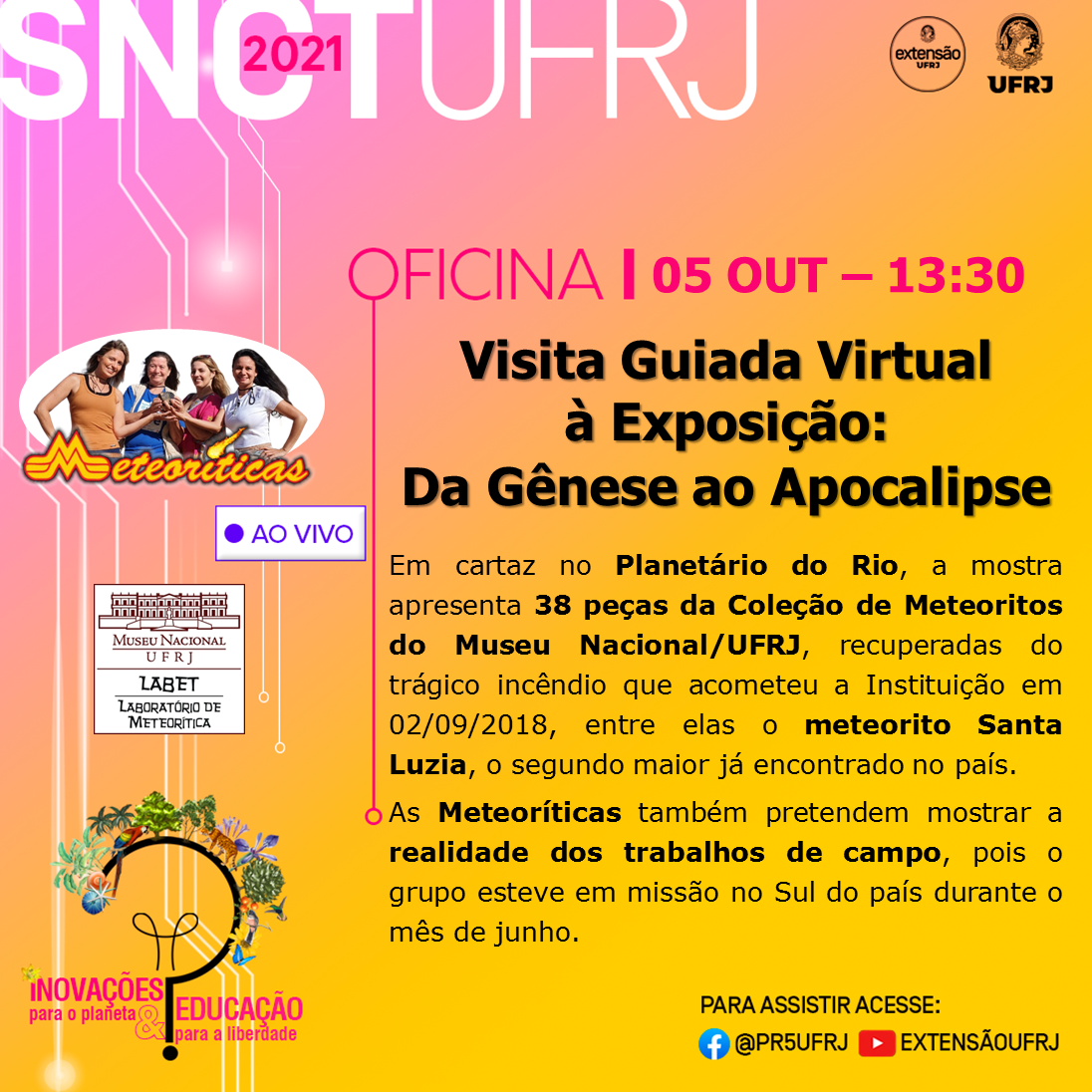 Nesse contexto, em 05/10 (terça-feira), de 13:30 às 14:30, as Meteoríticas realizarão uma Visita Guiada Virtual à Exposição “Da Gênese ao Apocalipse”, em cartaz no Planetário do Rio desde julho deste ano. A mostra apresenta 38 peças da Coleção de Meteoritos do Museu Nacional (MN/UFRJ), recuperadas do trágico incêndio que acometeu a Instituição em 02/09/2018, entre elas o meteorito Santa Luzia, o segundo maior já encontrado no país.